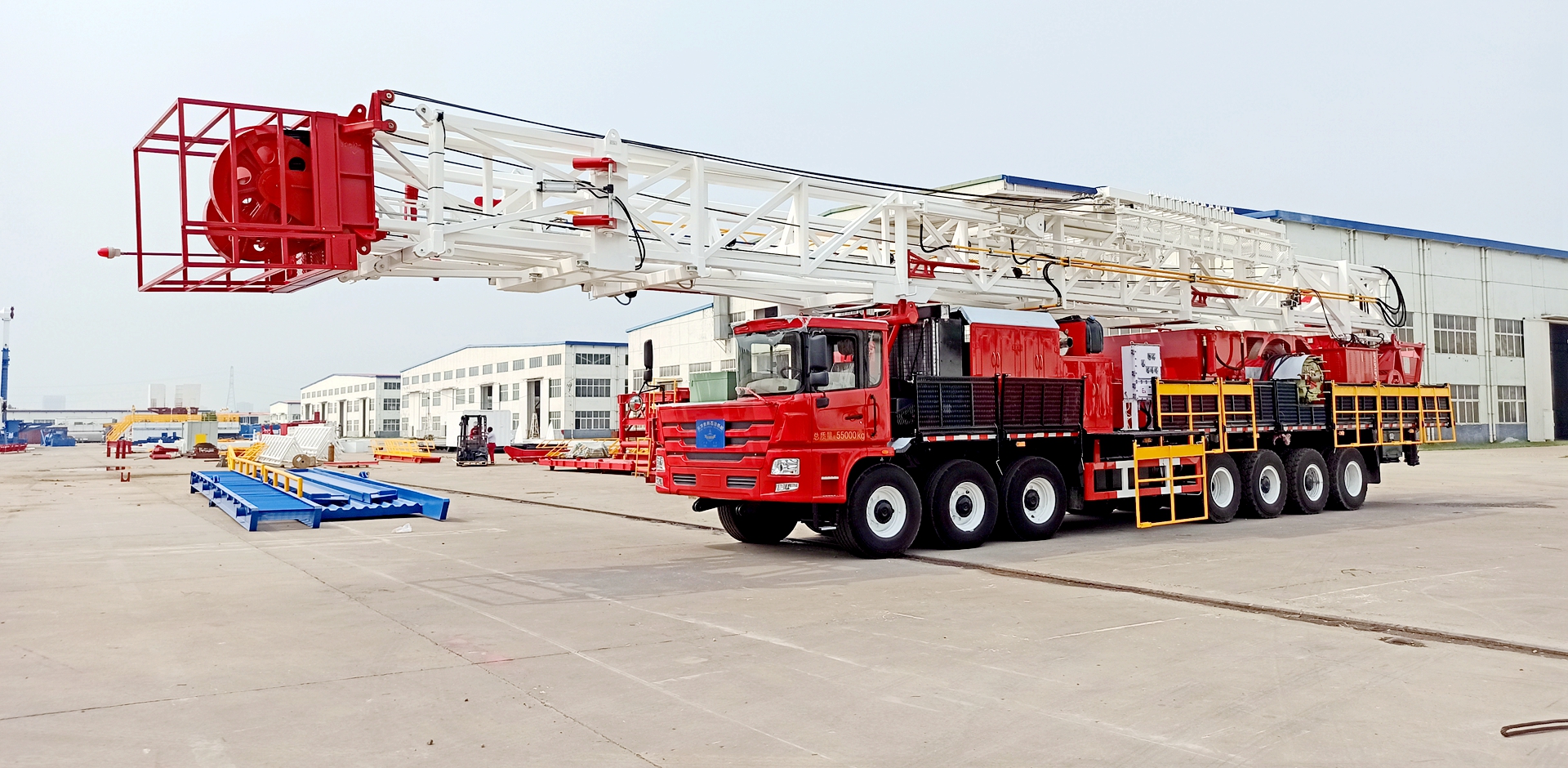拖裝鉆機的動力、絞車、井架、游車系統(tǒng)及傳動機構(gòu)全部裝載于半掛底盤上,移運時用牽引車拖掛移運至現(xiàn)場,該類產(chǎn)品對于提高鉆井作業(yè)搬遷效率具有很大的優(yōu)勢,適應(yīng)于中淺井鉆井作業(yè)。